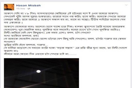ফেসবুক পাতায় মিসবাহ আরও লিখেছেন, আমাকে দেখতে আসার নেমন্তন করি। তবে আমার এ আকাশে সকাল হয় না, নামে না সন্ধ্যে। টিউব লাইটের আলোয় যেন সব একাকার।