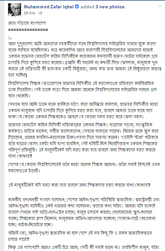 আজ দুপুরবেলা আমি আমাদের সহকর্মীদের সাথে বিশ্ববিদ্যালয় লাইব্রেরির সামনে বুকে কালো ব্যাজ লাগিয়ে বসেছিলাম। মাত্র কয়েকদিন আগে রাজশাহী বিশ্ববিদ্যালয়ের আমাদের মতোই একজন প্রফেসর রেজাউল করিম সিদ্দিকীকে কয়েকজন কমবয়সী তরুণ মোটর সাইকেলে এসে চাপাতি দিয়ে কুপিয়ে হত্যা করেছে। (আমি কী সহজেই না কথাটি লিখে ফেললাম, মানুষকে খুন করার এই প্রক্রিয়াটি কী ভয়ংকর একটি নিষ্ঠুরতা, অথচ কত দ্রুত আমরা এই নিষ্ঠুরতায় অভ্যস্ত হয়ে যাচ্ছি!)