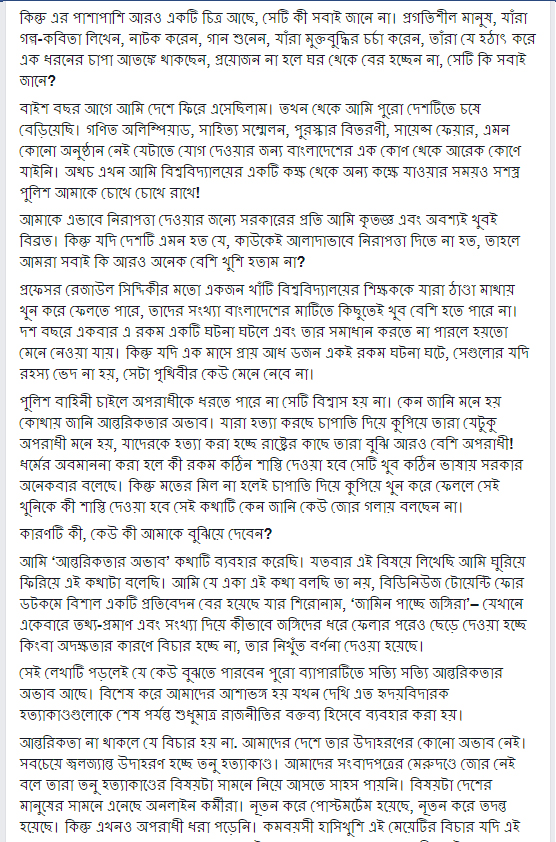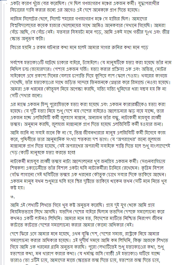 দেশে ফিরে এসে আমার মনে হয়েছে, এখন বুঝি দেশ, দেশের সমাজ, রাষ্ট্রকে নিয়ে আমার সমালোচনা করার অধিকার হয়েছে। এই সুদীর্ঘ সময়ে আমি কম লিখিনি, কিন্তু আজকে লিখতে গিয়ে আমি এক ধরনের গ্লানি অনুভব করছি। পুরো লেখাটিতেই শুধু হত্যাকাণ্ডের কথা, শুধু হতাশার কথা, মন খারাপ করার কথা। যে ধর্মান্ধ জঙ্গি গোষ্ঠী এই হত্যাকাণ্ড ঘটিয়ে যাচ্ছে তারাও তো এটিই চায়, আমাদের মাজে ক্ষোভের জন্ম দিতে চায়, হতাশার জন্ম দিতে চায়, আতঙ্ক ছড়িয়ে দিতে চায়।