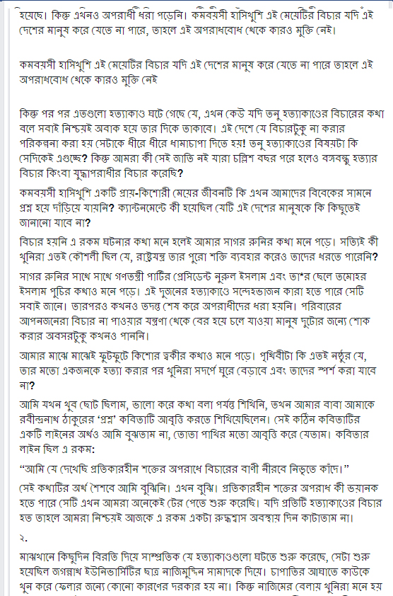 কমবয়সী হাসিখুশি এই মেয়েটির বিচার যদি এই দেশের মানুষ করে যেতে না পারে তাহলে এই অপরাধবোধ থেকে কারও মুক্তি নেই