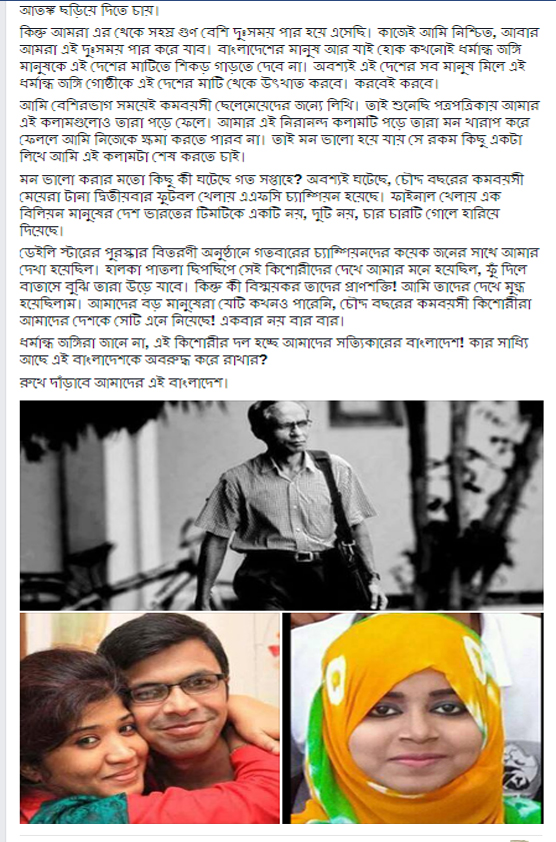 কিন্তু আমরা এর থেকে সহস্র গুণ বেশি দুঃসময় পার হয়ে এসেছি। কাজেই আমি নিশ্চিত, আবার আমরা এই দুঃসময় পার করে যাব। বাংলাদেশের মানুষ আর যাই হোক কখনোই ধর্মান্ধ জঙ্গি মানুষকে এই দেশের মাটিতে শিকড় গাড়তে দেবে না। অবশ্যই এই দেশের সব মানুষ মিলে এই ধর্মান্ধ জঙ্গি গোষ্ঠীকে এই দেশের মাটি থেকে উৎখাত করবে। করবেই করবে।