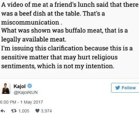 এরপরও বিতর্ক চলছে। যদিও এখনও তার ইন্সটাগ্রাম পেইজে গরুর মাংসের ছবি রয়ে গেছে। ইন্ডিয়া টুডের ভাষ্যমতে, পরবর্তীতে টুইটারে এক পোস্টে গরুর মাংস খাওয়ার কথা অস্বীকার করে কাজল বলেন, গরুর মাংস নয় বরং বৈধ উপায়ে পাওয়া মহিষের মাংস ছিলো এটি। যদিও খাবার পরিবেশনের সময় ভিডিওটিতে এটিকে গ