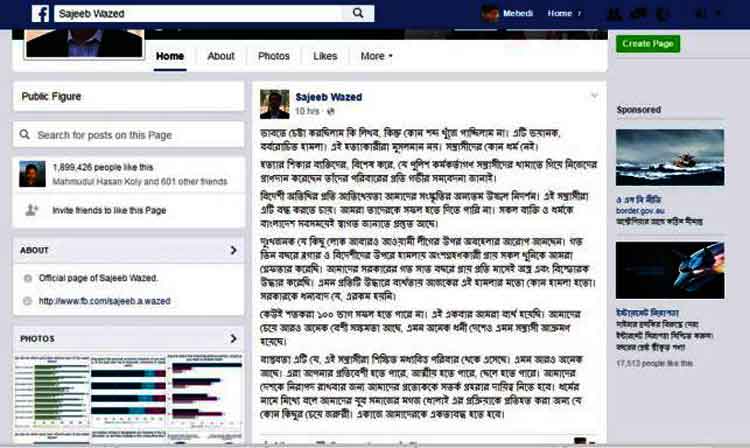 গুলশানে হলি আর্টিজান বেকারি রেস্তোরাঁয় জঙ্গি হামলায় নিহত হওয়ার ঘটনায় প্রধানমন্ত্রী শেখ হাসিনার পুত্র ও তার তথ্যপ্রযুক্তি–বিষয়ক উপদেষ্টা সজীব ওয়াজেদ জয় ফেসবুকে নিজের পেজে একটি পোস্ট দিয়েছেন। সেখানে তিনি যা লিখেছেন তা প্রতিক্ষণের পাঠকদের জন্য তুলে ধরা হলো।