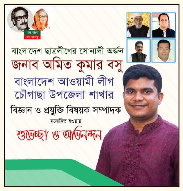 চৌগাছা উপজেলা আওয়ামীলীগের বিজ্ঞান ও প্রযুক্তি বিষয়ক সম্পাদক নির্বাচিত হলেন অমিত কুমার বসু।