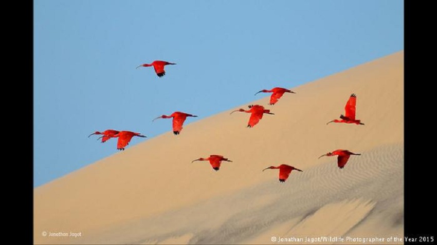 সারস গোত্রীয় এই লালপাখিদের ছবিটি তোলা হয় ব্রাজিলে৷ আলোকচিত্রী ছিলেন ফ্রান্সের জোনাথান জ্যাগো৷ পুরস্কার জিতেছেন ১৫ থেকে ১৭ (বছর) বিভাগে৷ ইলহা দো লঁসোয়া সৈকতে ডিঙি বেঁধে লাল আইবিসদের কাঁকড়া ধরা দেখছিলেন জোনাথান৷ আইবিসরা উড়ে যাবার সময় জোনাথান তাদের ছবি তোলেন৷