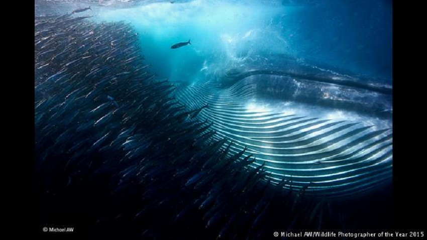 অস্ট্রেলিয়ার মাইকেল অ’ জলের নীচে ফটোগ্রাফিতে সেরা পুরস্কারটি জিতেছেন একটি ব্রাইড্স হোয়েল গোত্রীয় তিমি মাছ ছোট সার্ডিন মাছেদের ঝাঁকের উপর ধাওয়া করছে, এই ছবিটি তুলে৷ একবার হাঁ করলেই গোটা ঝাঁকটা তার মুখে ঢুকে যেতে পারে, পেটের কথা না হয় বাদই গেল!