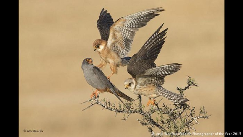 পক্ষি বিভাগে জিতেছে তিনটি লাল-পা শিকরী বাজের একটি ছবি, তুলেছেন ইসরায়েলের আমির বেন-ডভ৷ শীতে ইউরোপ থেকে আফ্রিকা যাবার আগে পাখিগুলো বাইট সেমেশ-এ একটু জিরিয়ে নিচ্ছে৷