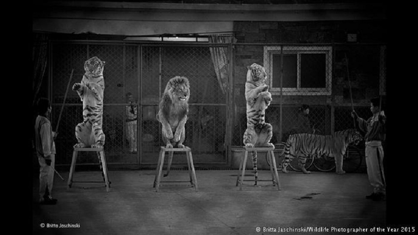 ‘‘এই বাঘ-সিংহগুলোকে আফিম গেলানো থেকে শুরু করে তাদের দাঁত-নখ উপড়ে নেওয়া, সার্কাস চলার সময় বল্লম দিয়ে খোঁচা দেওয়া, সব কিছু করা হয়েছে’’, লিখেছেন ‘সিঙ্গল ইমেজ’ বিভাগে বিজয়ী জার্মানি তথা ব্রিটেনের ব্রিটা ইয়াশিন্সকি৷ চীনের গুইলিন-এর একটি সার্কাসের দৃশ্য৷ মাঝের প্রাণীটি আবার একটি ‘লাইগার’, যার বাপ হলো সিংহ কিন্তু মা একটি বাঘ! এই লাইগার নাকি বিশ্বের সবচেয়ে বড় মার্জার৷