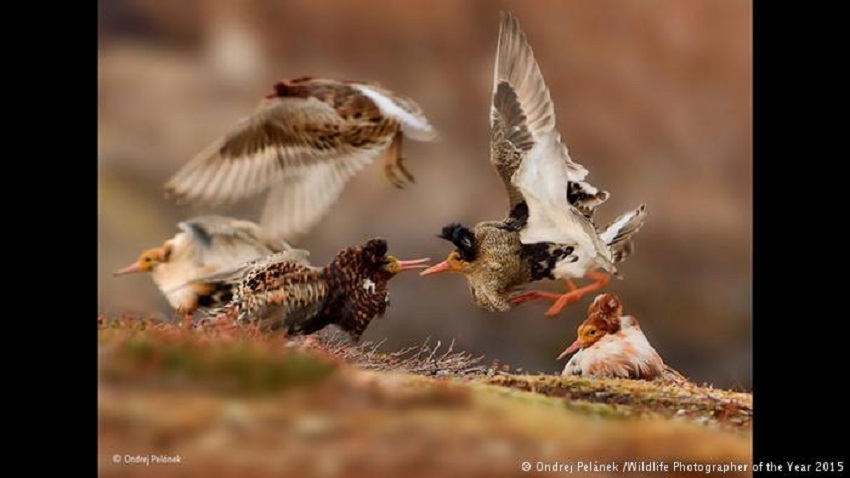 ইয়ং ওয়াইল্ডলাইফ ফটোগ্রাফার অফ দ্য ইয়ার পুরস্কারটি পেয়েছেন চেক প্রজাতন্ত্রের অনজ্রেই পেলানেক৷ নরওয়ের গ্রীষ্মে দিনরাত আলো থাকে৷ অনজ্রেই তাঁর ঘেরাটোপে বসে এই দুটি পুরুষ ‘রাফ’ বা গলকণ্ঠী পাখির ছবি তোলেন, অবশ্যই তাদের ঝগড়া মেয়ে পাখিটিকে নিয়ে৷