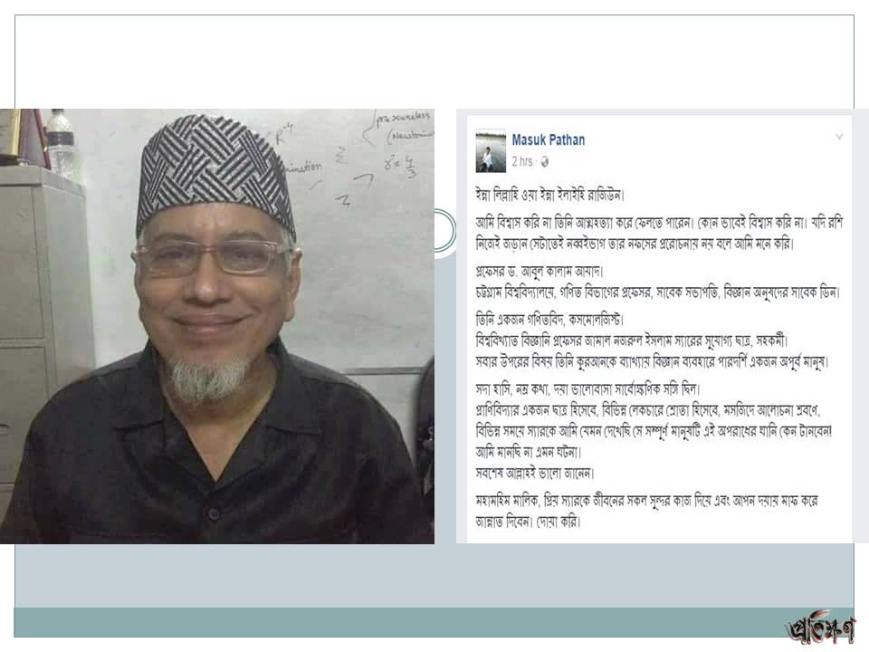 ইন্না লিল্লাহি ওয়া ইন্না ইলাইহি রাজিউন। আমি বিশ্বাস করি না তিনি আত্মহত্যা করে ফেলতে পারেন। কোন ভাবেই বিশ্বাস করি না। যদি রশি নিজেই জড়ান সেটাতেই নব্বইভাগ তার নফসের প্ররোচনায় নয় বলে আমি মনে করি।