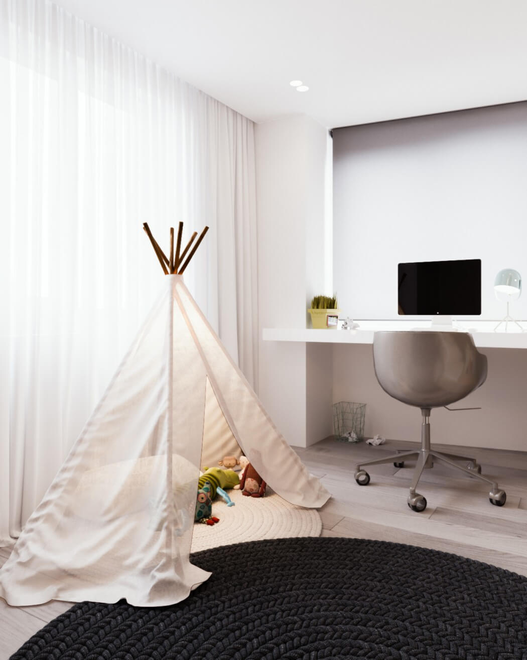 বাবা, মা আর ছোট্ট মেয়ে- ৩ জনের পরিবারের জন্য চমৎকার একটা ঘরের নকশা করেছেন স্থপতি জোভান জাহর্ডনি। বেলারুশের রাজধানী মিনস্কে এই ফ্ল্যাটটির অবস্থান। বাবা-মা আর সন্তানের আলাদা জগত থাকে। এই দুই জগতের মাঝে নান্দনিক ভারসাম্য বজায় রাখার চেষ্টা করেছেন তিনি।