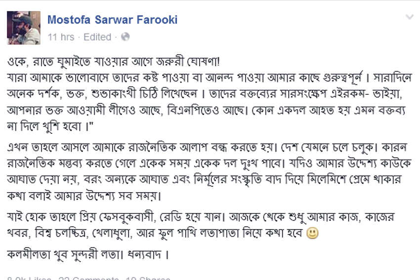 শেষ পর্যন্ত ফেসবুকে আর কোন রাজনৈতিক স্ট্যাটাস দিবেন না বলে ফেসবুকে স্ট্যাটাস দিয়েছেন পরিচালক মোস্তফা সারওয়ার ফারুকী। তার স্ট্যাটাসটি হুবুহু তুলে দেয়া হলঃ