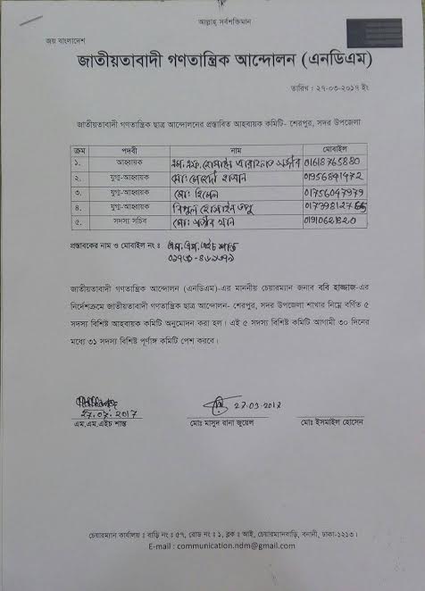 সংবাদ মাধ্যমে পাঠানো প্রেস বিজ্ঞপ্তি থেকে জানা গেছে, সাদা কাগজে কমিটিগুলোর আহবায়কদের স্বাক্ষরিত পদত্যাগপত্রের মাধ্যমে গণ পদত্যাগ করেন জাতীয়তাবাদি গণতান্ত্রিক ছাত্র আন্দোলনের এসব নেতাকর্মী।