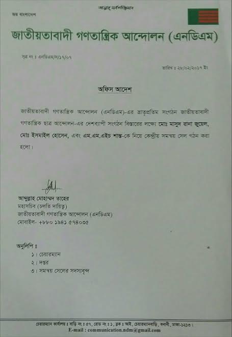এদিকে আরো একটি ফেসবুক বার্তায় জানা যায়, এম এম এইচ রুবেলকেও বহিস্কার করা হয়েছে পদত্যাগের দু’দিন পর। এসব নিয়ে কথা হয়, এনডিএম’র মহাসচিব, এশিয়ান ইউনির্ভাসিটির শিক্ষক আবদুল্লাহ এম তাহের এর সাথে। তিনি বলেন, পদত্যাগ করলেই যে তা গ্রহন করা হয়েছে, তাও তো নয়। তিনি প্রশ্ন করেন, সময় মতো পদত্যাগপত্রটি এসেছে কিনা, তাও তো খতিয়ে দেখতে হবে। আর ফেসবুকে দেয়া পোষ্ট প্রসঙ্গে তাহের বলেন এনডিএম’র অফিসিয়াল ফেসবুকে এধরনের কিছু নিশ্চয় দেয়া হয়নি? তিনি বলেন, ছাত্র সংগঠনটি কোনভাবেই এনডিএম’র অঙ্গ বা সহযোগী অংশ নয়, তারা ভ্রাতৃপ্রতিম। সুতরাং এসব বিষয় তারাই ভালো বলতে পারবেন। তাদের বিষয় মূল দলের মহাসচিব’র কিছু বলার নেই। তারপরও কিছু জানার থাকলে, তাদের অভিভাবক-এনডিএম চেয়ারম্যান’র ব্যক্তিগত বিশেষ সহকারী কাম এনডিএম সাংগঠনিক সম্পাদক, “স্বপ্নের দেশ”র সমন্বয়ক মোমিনুল আমিনের সঙ্গে কথা বলবার পরামর্শ দেন একমাস আগে আত্মপ্রকাশ করা নতুন দল