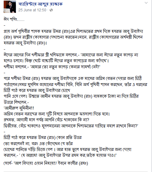 ব্যারিস্টার আব্দুর রাজ্জাক ফেসবুকে একজন জনপ্রিয় ব্যক্তিত্ব। তাঁর ফেসবুক পেইজে দেড় লাখেরও বেশি মানুষের লাইক রয়েছে। গত ২৫ জুন ব্যারিস্টার রাজ্জাক ঈদ শপিং এ আমাদের যথেচ্ছ খরচকে ইঙ্গিত করে ইসলামের খলিফা অর্ধ পৃথিবীর শাসক হযরত উমর (রাঃ) মিতব্যয়ী ও সংযমী জীবনযাপনের এক অনন্য নিদর্শন তুলে ধরেছেন এক ফেসবুক স্ট্যাটাসের মাধ্যমে।