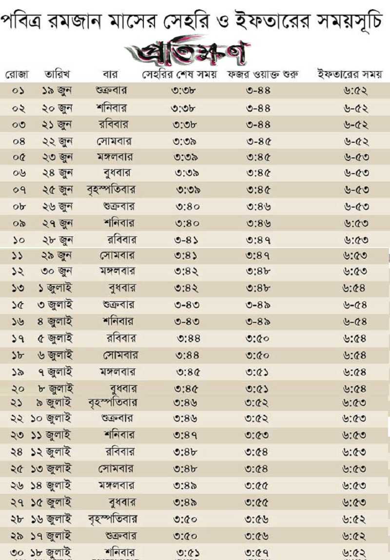 বি.দ্র. : সেহরির শেষ সময় সতর্কতামূলকভাবে সুবেহ সাদেকের ৩ মিনিট পূর্বে ধরা হয়েছে এবং ফজরের ওয়াক্তের শুরু সুবেহ সাদেকের ৩ মিনিট পর রাখা হয়েছে। সেহরির সতর্কতামূলক শেষ সময়ের ৬ মিনিট পর ফজরের আযান দিতে হবে। সূর্যাস্তের পর সতর্কতামূলকভাবে ৩ মিনিট বাড়িয়ে ইফতারের সময় নির্ধারণ করা হয়েছে। সূত্র : বাসস