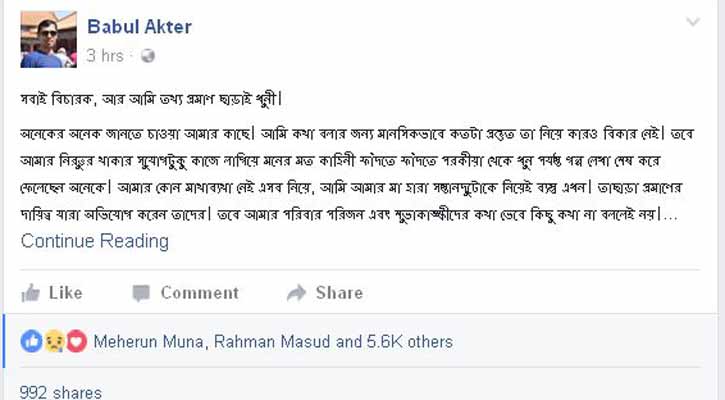 অনেকের অনেক জানতে চাওয়া আমার কাছে। আমি কথা বলার জন্য মানসিকভাবে কতটা প্রস্তুত তা নিয়ে কারও বিকার নেই। তবে আমার নিরুত্তর থাকার সুযোগটুকু কাজে লাগিয়ে মনের মত কাহিনী ফাঁদতে ফাঁদতে পরকীয়া থেকে খুন পর্যন্ত গল্প লেখা শেষ করে ফেলেছেন অনেকে। আমার কোন মাথাব্যথা নেই এসব নিয়ে, আমি আমার মা হারা সন্তানদুটোকে নিয়েই ব্যস্ত এখন। তাছাড়া প্রমাণের দায়িত্ব যারা অভিযোগ করেন তাদের। তবে আমার পরিবার পরিজন এবং শুভাকাঙ্ক্ষীদের কথা ভেবে কিছু কথা না বললেই নয়।
