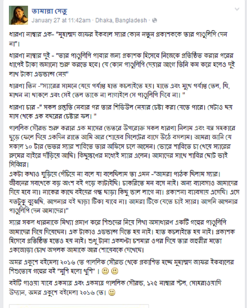 স্যার সকল ধারনাকে মিথ্যা প্রমাণ করে শিশুদের নিয়ে লিখা অসাধারণ একটি গল্পের পাণ্ডুলিপি আমাদের দিয়ে দিয়েছেন। এক টাকাও এডভান্স দিতে হয় নাই। হাত কচলাইতে হয় নাই। প্রকাশক হিসেবে প্রতিষ্ঠিত হতেও হয় নাই। শুধু টানা একঘণ্টা চশমার ওপর দিয়ে তার জহুরীর মতো একজোড়া চোখ অপলক আমাকে আর শোয়েবকে দেখেছে।