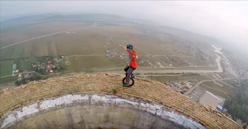 স্টান্টম্যান ফ্লাভিউ চারনেস্কু নামের এক বালক রোমানিয়ায় ২৫০ মিটার উঁচু এক চিমনির ওপর এক চাকার ইউনি-সাইকেল চালিয়ে স্টান্ট দেখিয়েছেন।