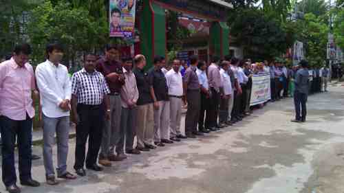 রবিবার ১১টায় আনন্দমোহন কলেজের গেইটে মানববন্ধনে অংশগ্রহণ করেন কলেজ শিক্ষকরা।