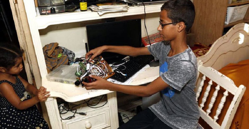টেক্সাসের আরভিন শহরের ম্যাক আর্থার হাইস্কুলের নবম শ্রেণির ছাত্র আহমেদ মোহামেদ (১৪) বোমা বানানোর গুজব ছড়িয়ে আমেরিকায় এক মুসলিম কিশোরকে আটক করেছে পুলিশ। জানা গেছে ঐই কিশোর বাসায় বসে ঘরি বানাতো। তার ইচ্ছে ছিল বাড়িতে তার হাতে তৈরি ঘড়ি দেখিয়ে সকলকে চমকে দেবে সে। নিছক হাতে তৈরি ঘড়ি বানিয়ে তা নিয়ে স্কুলে নিয়ে যায় আহমেদ। তবে তা দেখে স্কুলের শিক্ষকরা যে এভাবে ভুল বুঝবেন এবং তাকে গ্রেফতার হতে হবে তা স্বপ্নের কল্পনা করতে পারেনি সে।