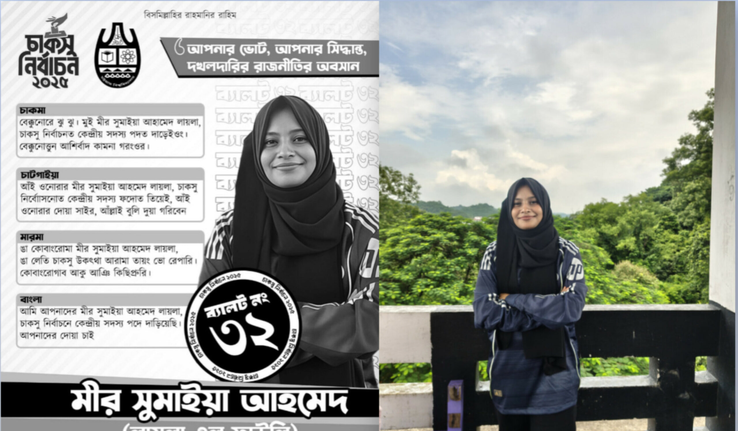 চট্টগ্রাম বিশ্ববিদ্যালয় কেন্দ্রীয় ছাত্র সংসদ (চাকসু) নির্বাচনে ভিন্নধর্মী প্রচারণায় নজর কাড়ছেন সমাজতত্ত্ব বিভাগের ২০২০–২১ সেশনের শিক্ষার্থী মীর সুমাইয়া আহমেদ লায়লা। সদস্য পদপ্রার্থী এই শিক্ষার্থী প্রচারণায় ভোট চেয়েছেন চারটি ভাষায়—বাংলা, চাকমা, মারমা ও চট্টগ্রামের স্থানীয় ভাষায়।
