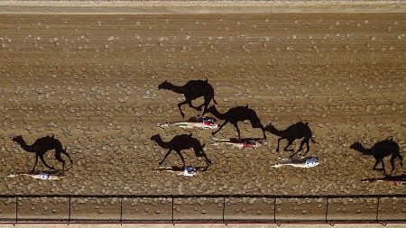 উটের দৌড় প্রতিযোগিতার এই ছবিটি দুবাই থেকে তোলা। প্রতিবছরই দেশটিতে জনপ্রিয় এই প্রতিযোগিতা অনুষ্ঠিত হয়ে থাকে। প্রতিযোগিতা চলাকালীন সময়ে ঠিক মাথার উপর  থেকে ৯০ ডিগ্রী কোণে তোলা এই ছবিটিতে আপনি উটকে সাবজেক্ট হিসেবে না দেখে ছায়াকে সাবজেক্ট হিসেবে দেখতে পাচ্ছেন। আর  বিচিত্র এই ছবিটি তুলেছেন দুবাইয়ের প্রখ্যাত ফটোগ্রাফার  শোয়েব।