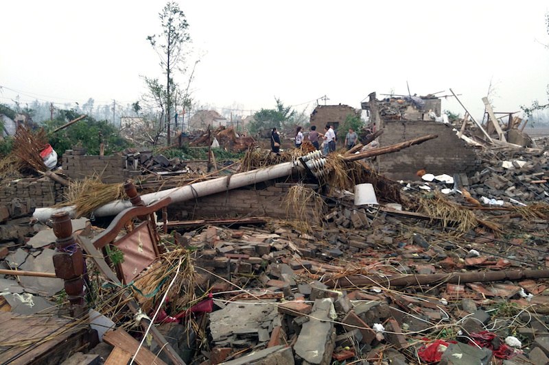 Residents past through houses destroyed in the aftermath of a tornado that hit Funing county in Yancheng city in eastern China's Jiangsu Province on Thursday, June 23, 2016. A powerful tornado killed dozens and destroyed large numbers of buildings Thursday in the eastern Chinese province of Jiangsu, state media reported. (Color China Photo via AP) CHINA OUT