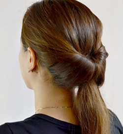 চুলগুলো ভালোভাবে সেট করে নিয়ে বেশ উঁচু করে একটি ঝুটি করে নিন। একটি পাতলা হেয়ারব্যান্ড দিয়ে পনিটেইল আটকে নিতে হবে। এবার খানিকটা চুল আলাদা করে নিয়ে পনিটেইলের ব্যান্ডটি মুড়িয়ে নিতে হবে। এমনভাবে