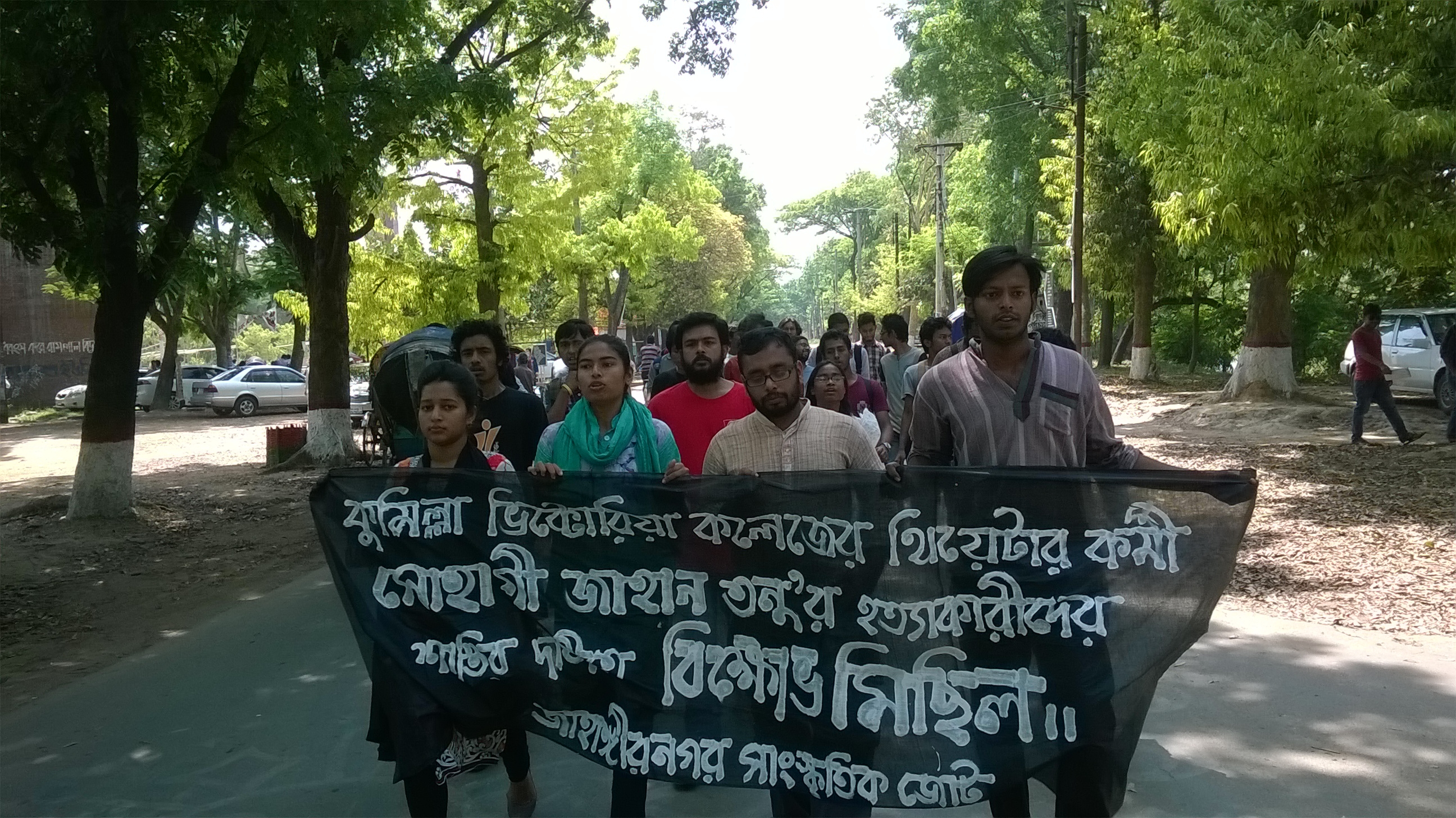 tonuকুমিল্লা ভিক্টোরিয়া কলেজের ইতিহাস বিভাগের দ্বিতীয় বর্ষের শিক্ষার্থী সোহাগী জাহান তনু’র হত্যাকারীদের শাস্তির দাবিতে বিক্ষোভ মিছিল করেছে জাহাঙ্গীরনগর বিশ্বিবদ্যালয়ের শিক্ষার্থীরা। বুধবার সকাল ১১টার দিকে জাহাঙ্গীরনগর বিশ্বিবিদ্যালয় সাংস্কৃতিক জোটের ব্যানারে বিক্ষোভ মিছিল করে তারা।