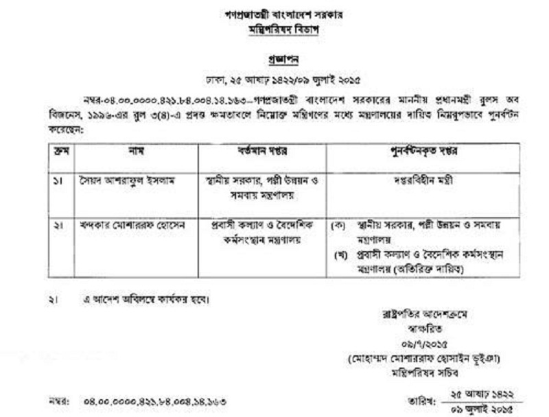 এলজিআরডি মন্ত্রী সৈয়দ আশরাফুল ইসলামকে শেষ পর্যন্ত দপ্তরবিহীন মন্ত্রী করা হয়েছে। এলজিআরডি মন্ত্রীর দায়িত্ব পেয়েছেন ইঞ্জিনিয়ার খন্দকার মোশারফ হোসেন।