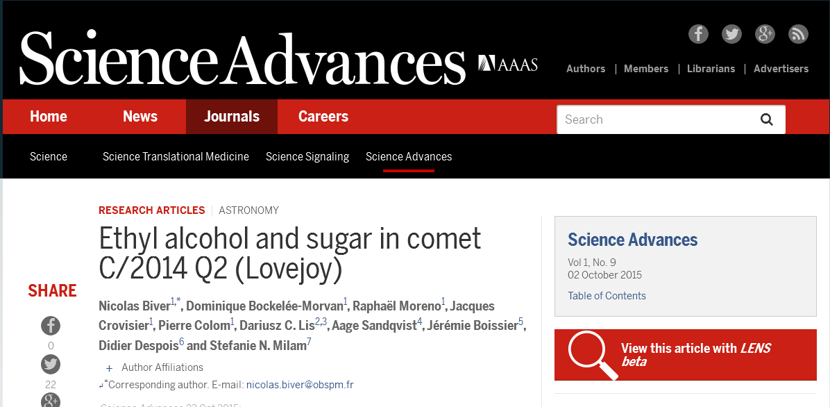 101932_webপ্রাণ সৃষ্টির পানি আর অক্সিজেন ছাড়া জন্য আরো যা-যা লাগে, সেই কার্বনের জটিল জৈব-যৌগ ইথাইল অ্যালকোহল আর চিনির অণুও পাওয়া গেছে মহাকাশে! যুগান্তকারী এই আবিষ্কারের খবরটি জানিয়েছে বিজ্ঞান-জার্নাল ‘সায়েন্স অ্যাডভান্সেসে। গবেষণাটি হয়েছে স্পেনের সিয়েরা নেভাদায় ইনস্টিটিউট দ্য রেডিও-অ্যাস্ট্রোনমি মিলিমেট্রিকে’।
