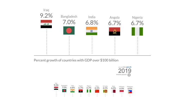 পূর্বাভাসে সিএনএন মানি বলছে, ২০১৯ সাল নাগাদ সবচেয়ে বেশি প্রবৃদ্ধি অর্জন করবে যেসব দেশের মধ্যে ২য় অবস্থানে থাকবে বাংলাদেশ। ২০১৯ সাল নাগাদ ৭ শতাংশ প্রবৃদ্ধি অর্জন করবে বাংলাদেশ। এসময় ৯ দশমিক ২ শতাংশ প্রবৃদ্ধি অর্জন করে শীর্ষে থাকবে ইরাক। বাংলাদেশের পরে ৬ দশমিক ৮ শতাংশ প্রবৃদ্ধি অর্জন করবে ভারত। ভারতের পরের ২টি স্থান থাকবে অ্যাঙ্গোলা ও নাইজেরিয়ার।