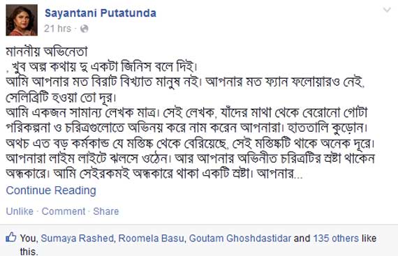 এবার সমালোচনায় যুক্ত হয়েছেন কলকাতার লেখিকা সায়ন্তী পুততুণ্ড। যিনি প্রসেনজিতের শঙ্খচিল সিনেমার চিত্রনাট্যকার। যিনি তার লেখনির মাধ্যম দিয়ে সমূচিত জবাব দিয়েছেন প্রসেনজিৎকে। পাঠকদের জন্য এ স্ট্যাটাসটি হুবুহু তুলে ধরা হলো।
