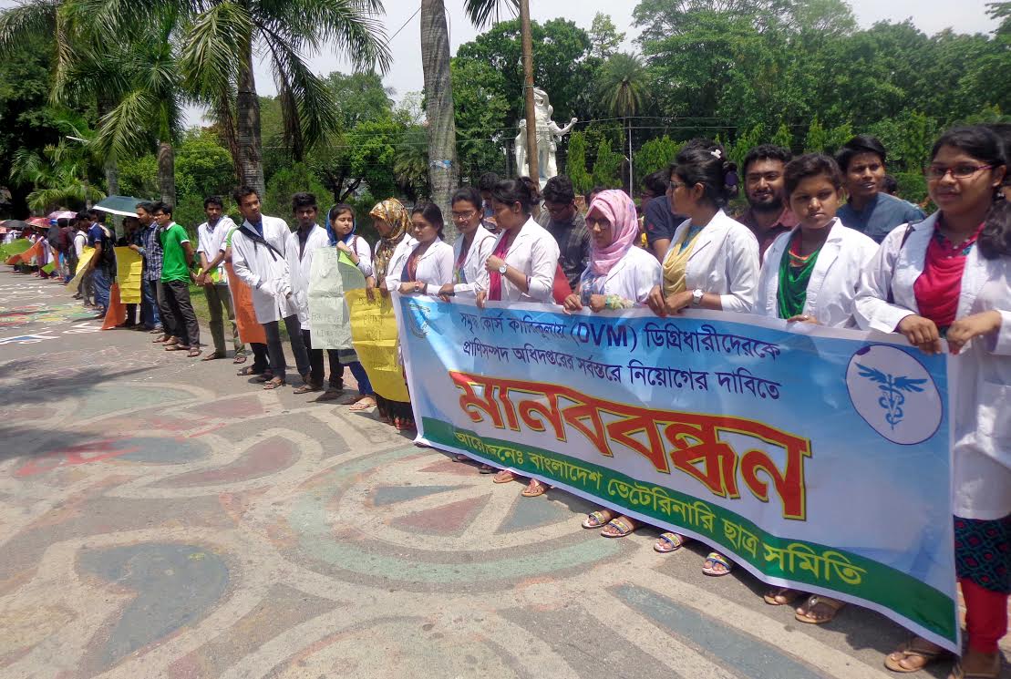 বাংলাদেশ কৃষি বিশ্ববিদ্যালয়ের (বাকৃবি) প্রাণিসম্পদ অধিদপ্তরের সর্বস্তরের ডক্টর অব ভেটেরিনারি মেডিসিন (ডিভিএম) ডিগ্রীধারীদের নিয়োগের দাবিতে রবিবার মানববন্ধন করেছে ভেটেরিনারি অনুষদের শিক্ষার্থীরা।