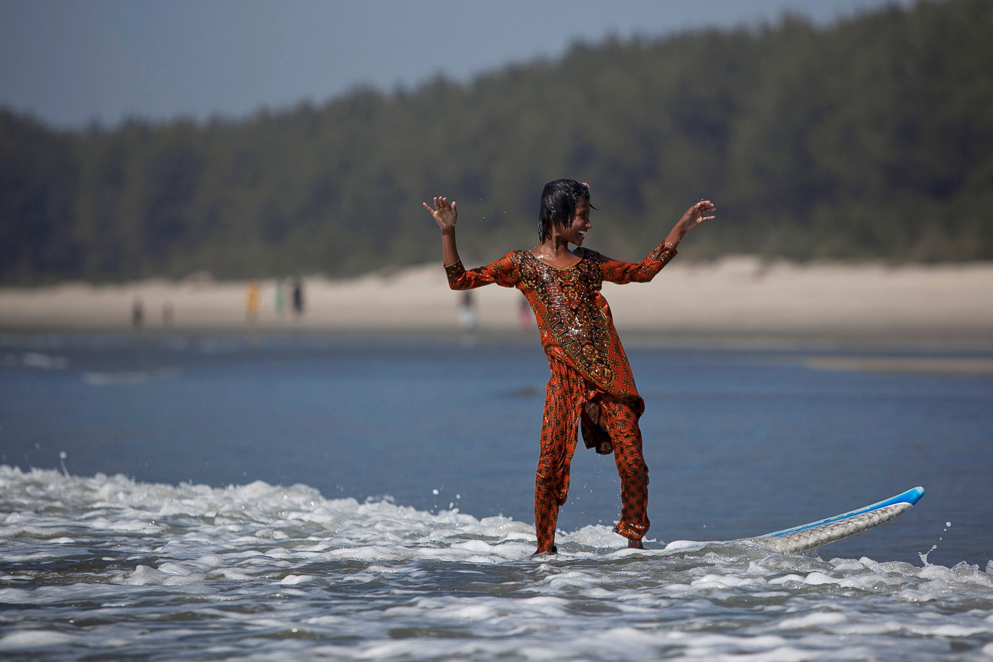 Johanara surfs during a break from selling chips on the beach in Cox's Bazar.
