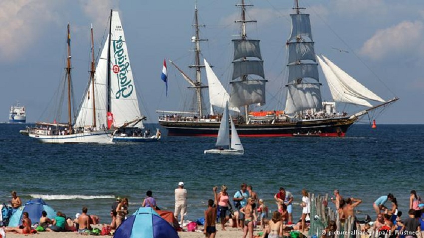 বালটিক সাগরের ভার্নেম্যুন্ডে সৈকতাবাসের সামনে পালতোলা জাহাজের বহর৷