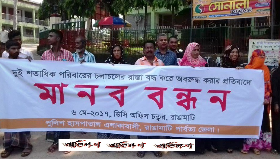 রাঙামাটি শহরের পুলিশ হাসপাতাল এলাকার জনসাধারণের চলাচলের রাস্তা বন্ধ করে অবরুদ্ধ করার প্রতিবাদে মানববন্ধন করেছে পুলিশ হাসপাতাল এলাকাবাসী।