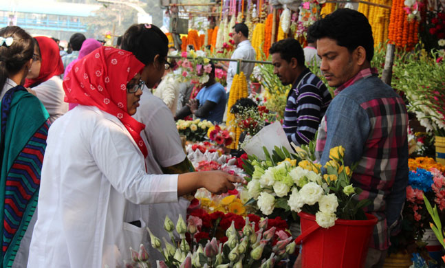 রাজধানীর মিরপুর শেওড়াপাড়া এলাকায় এমনই এক অস্থায়ী ফুলের দোকান নিয়ে বসেছেন কামরুজ্জামন তমাল নামের এক শিক্ষার্থী। তিনি বলেন, ‘বন্ধুরা মিলে একদিনের জন্য এ দোকান দিয়েছি। রাজধানীর একটি বেসরকারি বিশ্ববিদ্যালয়ে আমারা পড়াশোনা করি। ভালোবাসা দিবসে যেহেতু ফুলের চাহিদা বেশি থাকে সে কারণে আমরা পাইকারি দরে ফুল কিনে এনে পাড়ায় বিক্রি করছি। আজকে ফুলের ক্রেতা অনেক, তাই লাভও বেশি।’