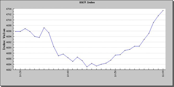 ডিএসই সূত্রে জানা যায়, বেলা ১১টায় ডিএসইর ব্রড ইনডেক্স বা ডিএসইএক্স সূচক ৫ পয়েন্ট বেড়ে ৪ হাজার ৭০১ পয়েন্টে অবস্থান করে। এছাড়া ডিএস-৩০ সূচক ৬ পয়েন্ট বেড়ে এক হাজার ৭৫৫ পয়েন্টে এবং ডিএসইএস সূচক ৪ পয়েন্ট বেড়ে এক হাজার ১১৯ পয়েন্টে স্থির হয়।