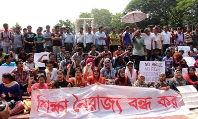 আন্দোলনরত শিক্ষার্থীরা পরীক্ষা বাতিলের দাবিতে বিভিন্ন স্লোগান দিচ্ছেন।