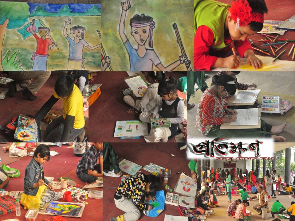 সকাল থেকে স্কুল প্রাঙ্গণ মুখোরিত হয়ে উঠে শিশুদের কলকাকলিতে। আর চারদিকে লাল-সবুজের ছড়াছড়ি। শিশুদের উৎসাহেরও কমতি ছিল না। বিভিন্ন স্কুল থেকে আগত ছাত্রছাত্রীরা বিজয়ের মুহূর্তটি নিয়ে ছবি আঁকার জন্য বেশ উদগ্রীব হয়ে ছিল।
