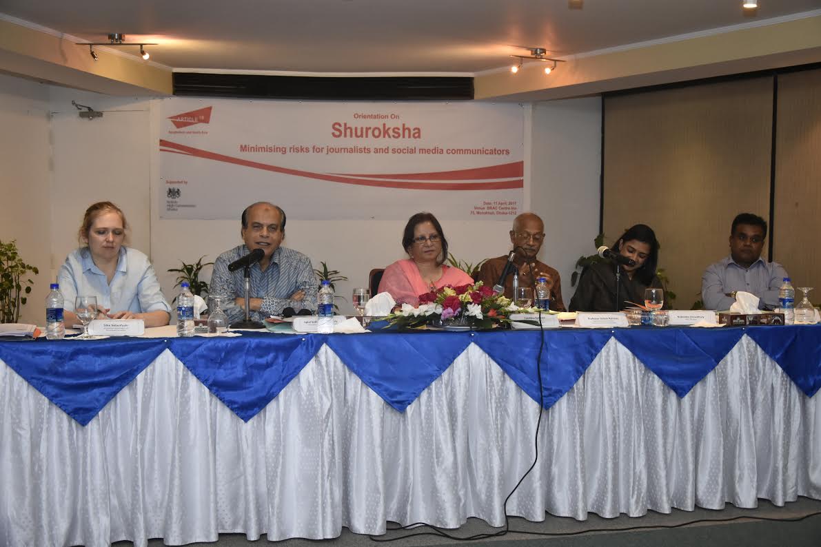 রাজধানীর ব্র্যাক সেন্টার ইন-এ মঙ্গলবার গণমাধ্যম কর্মীদের পেশাগত ঝুঁকি প্রশমন বিষয়ক ‘সুরক্ষা’ কর্মসূচির উদ্বোধন করা হয়। এ অনুষ্ঠানের সভাপতিত্ব করেন আর্টিকেল ১৯ এর বাংলাদেশ ও দক্ষিণ এশিয়া অঞ্চলের পরিচালক তাহমিনা রহমান।