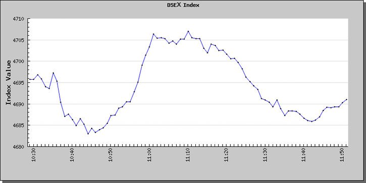 ডিএসইর ওয়েবসাইট সূত্রে জানা যায়, বেলা ১১টা ৫৩ মিনিটে ডিএসইর ব্রড ইনডেক্স বা ডিএসইএক্স সূচক ৪ পয়েন্ট কমে ৪ হাজার ৬৯০ পয়েন্টে অবস্থান করে। এছাড়া ডিএস-৩০ সূচক ১ পয়েন্ট বেড়ে এক হাজার ৭৫০ পয়েন্টে এবং ডিএসইএস সূচক ২ পয়েন্ট বেড়ে এক হাজার ১১৭ পয়েন্টে স্থির হয়।
