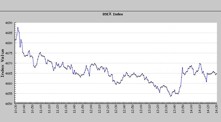 দুপুর ১২টা ১০ মিনিটে ডিএসইর ব্রড ইনডেক্স বা ডিএসইএক্স সূচক ১৪ পয়েন্ট কমে ৪ হাজার ৬৬৭ পয়েন্টে, ডিএস-৩০ সূচক ৮ পয়েন্ট কমে এক হাজার ৭২৯ পয়েন্টে এবং ডিএসইএস সূচক ১ পয়েন্ট কমে এক হাজার ১০৯ পয়েন্টে স্থির হয়।