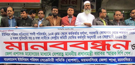 বুধবার সকালে বাংলাদেশ ইউনিয়ন পরিষদ সেক্রেটারি সমিতির উদ্যোগে ময়মনসিংহ শহরের সিকে ঘোষ রোডে প্রেসক্লাবের সামনে এ কর্মসূচী পালিত হয়।