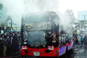 রাজধানী ঢাকার বায়তুল মোকাররম এলাকায় শিকড় পরিবহনের একটি যাত্রীবাহী বাসে আগুন দিয়েছে দুর্বৃত্তরা। রবিবার সন্ধ্যার পর বায়তুল মোকাররম জাতীয় মসজিদের দক্ষিণ গেইটে এ ঘটনা ঘটে। এ অগ্নিসংযোগের ঘটনায় তাৎক্ষণিক হতাহতের কোনো খবর পাওয়া যায়নি। বিএনপি নেতৃত্বাধীন ২০-দলীয় জোটের লাগাতার অবরোধের মধ্যে আজ থেকে শুরু হওয়া ৭২ ঘণ্টার হরতালের প্রথম দিন এ অগ্নিসংযোগের ঘটনা ঘটলো। প্রতিক্ষণ ..বিস্তারিত