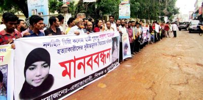 ঝালকাঠিতে গৃহবধূ ও কলেজ ছাত্রী মারুফা আক্তারের হত্যাকারীদের ২৪ ঘন্টার মধ্যে গ্রেফতার ও দৃষ্টান্তমূলক বিচারের দাবিতে মানববন্ধন করেছে এলাকাবাসী ও নলছিটি ডিগ্রি কলেজের শিক্ষার্থীরা। রোবাবার ঝালকাঠি জেলা প্রশাসক কার্যালয়ের সামনের সড়কে এ মানববন্ধনের আয়োজন করা হয়। মানববন্ধন শেষে ঝালকাঠি জেলা প্রশাসকের কাছে স্মরকলিপি প্রদান করা হয়। মানববন্ধনে বক্তারা বলেন, হত্যাকাণ্ডের আট দিন অতিবাহিত হলেও ঘটনায় ..বিস্তারিত